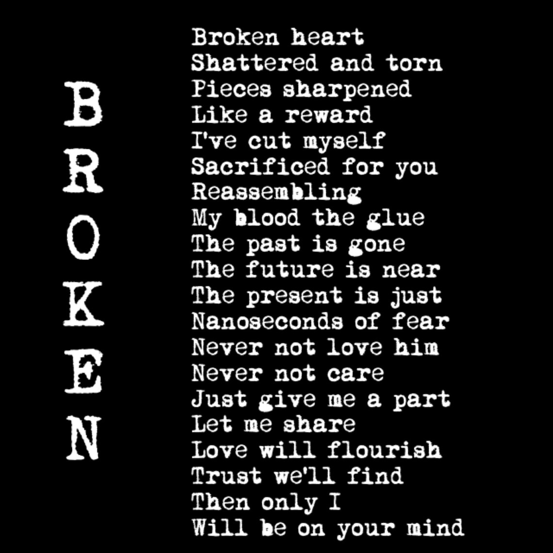 Broken photoclarkApril 10, 2016Poetry Post navigation PreviousNext 35.085584 -80.883918 Share this: Share on X (Opens in new window) X Share on Facebook (Opens in new window) Facebook Like Loading...