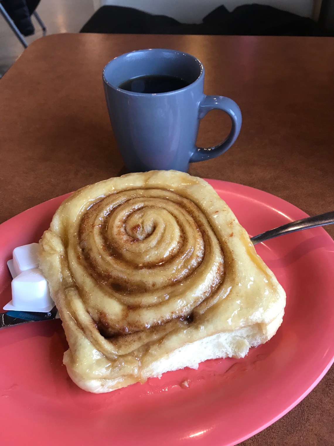 This morning we had yet another delay with the delivery, so I decided to go get a cup of coffee and relax or do an expense report. The little place by my hotel was open so I stopped. Much to my delight, this place is a bakery. The massive cinnamon rolls were calling my name; and, despite already having breakfast I succumbed to the calling. No regrets here. Lol